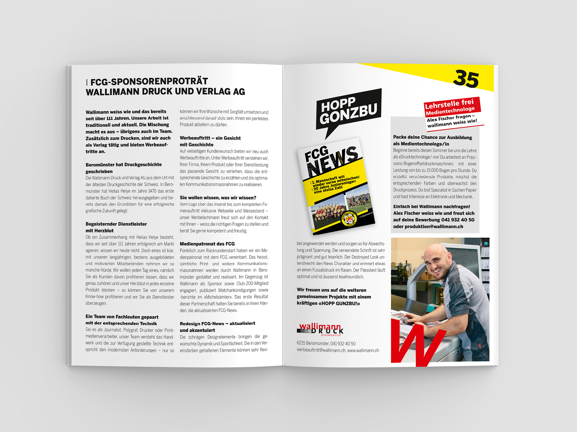 Für den Fussballclub im Michelsamt, den FC Gunzwil, produziert Wallimann bereits seit Jahren das zum Vor- und Rückrundenstart erscheinende FCG-NEWS. Pünktlich zum Rückrundenstart haben wir ein Medienpatronat mit dem FCG vereinbart. Das heisst, sämtliche Kommunikationsmassnahmen werden durch Wallimann in Beromünster gestaltet und realisiert. Im Gegenzug ist Wallimann als Sponsor sowie als Club-84-Mitglied engagiert und publiziert Matchankündigungen sowie -berichte im «Michelsämter». Das erste Resultat dieser Partnerschaft sind die aktualisierten FCG-News.