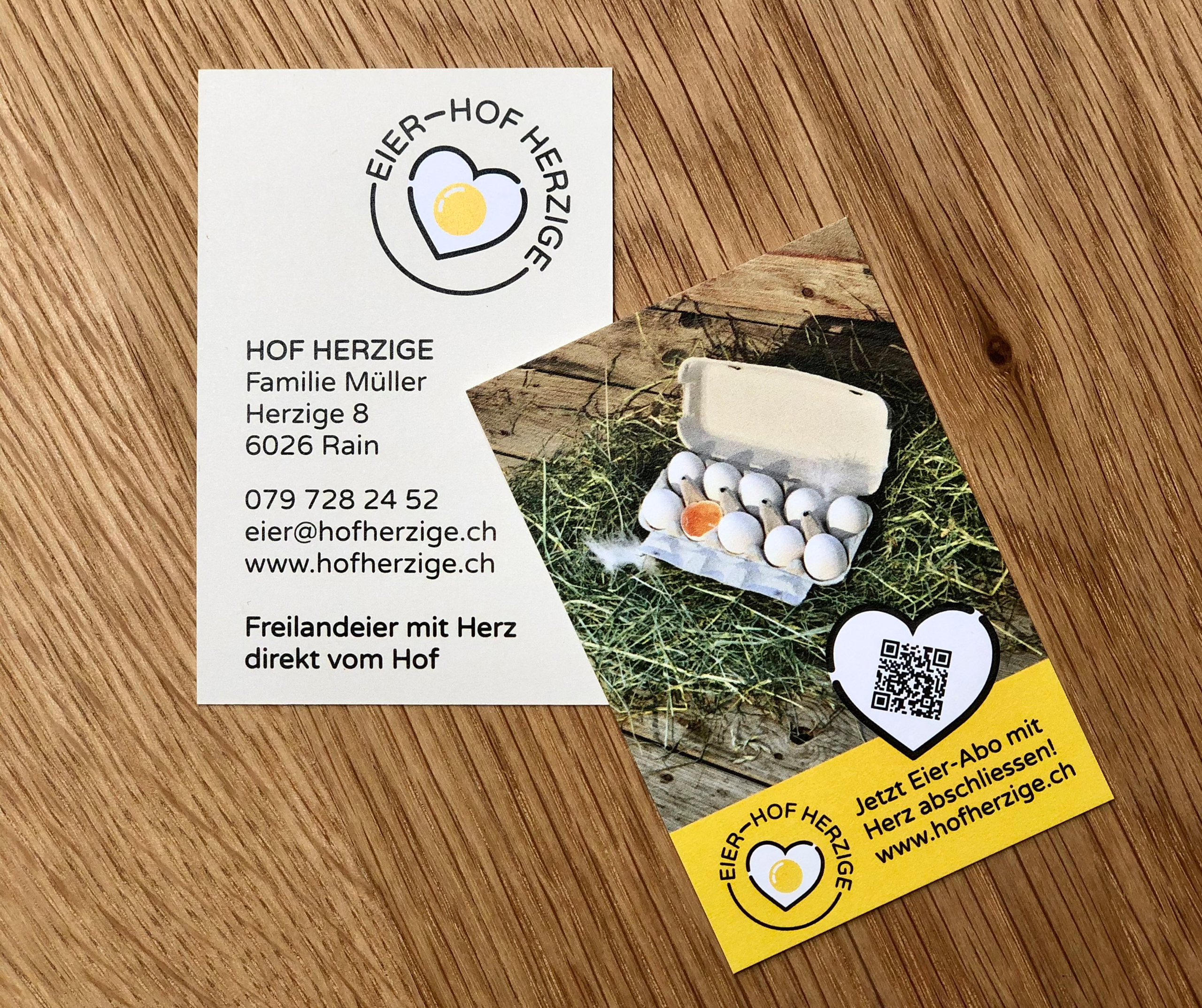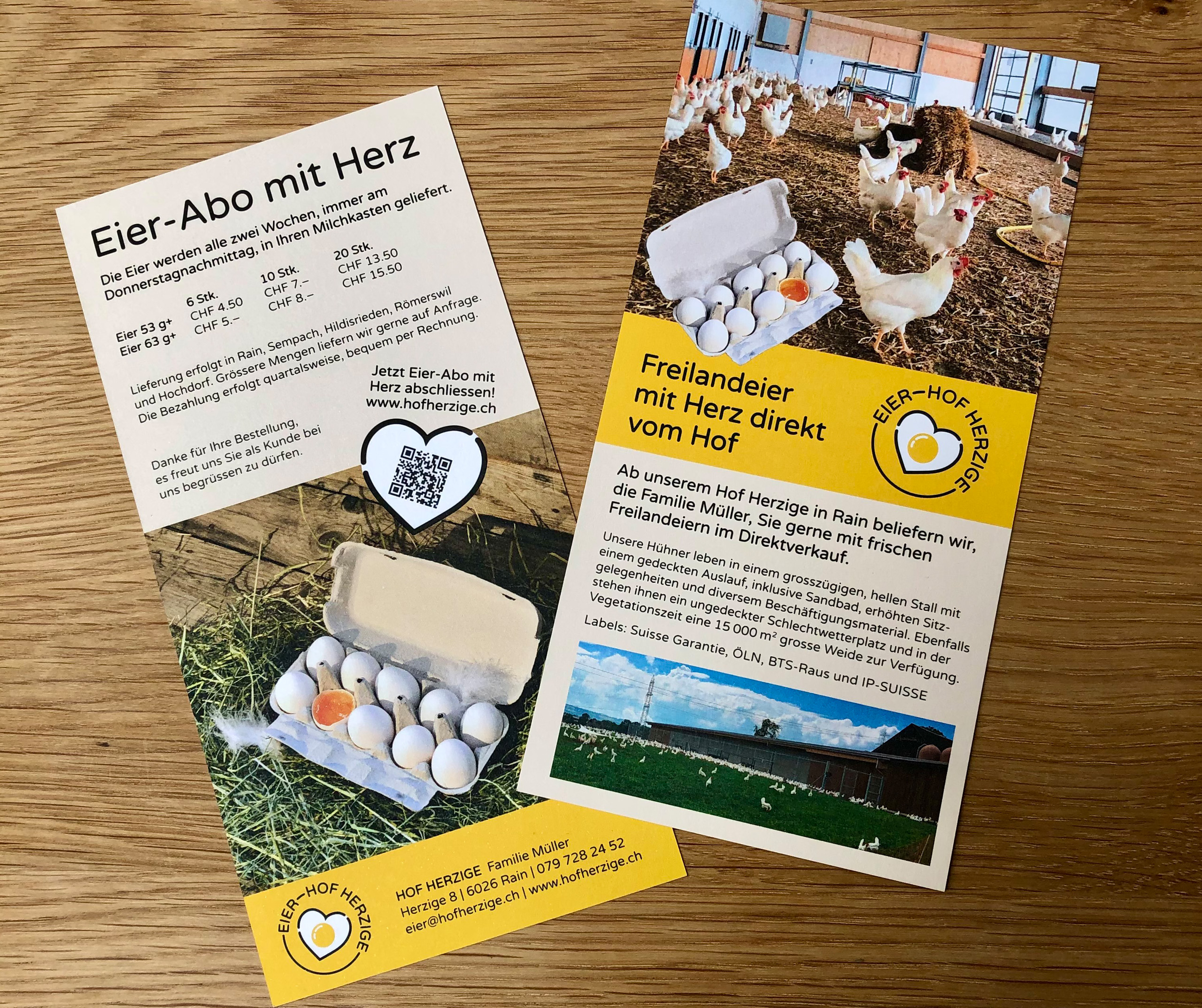 Freilandeier mit Herz direkt vom Hof – Name, Logo, Website mit Eier-Abo, Drucksachen – alles von Wallimann