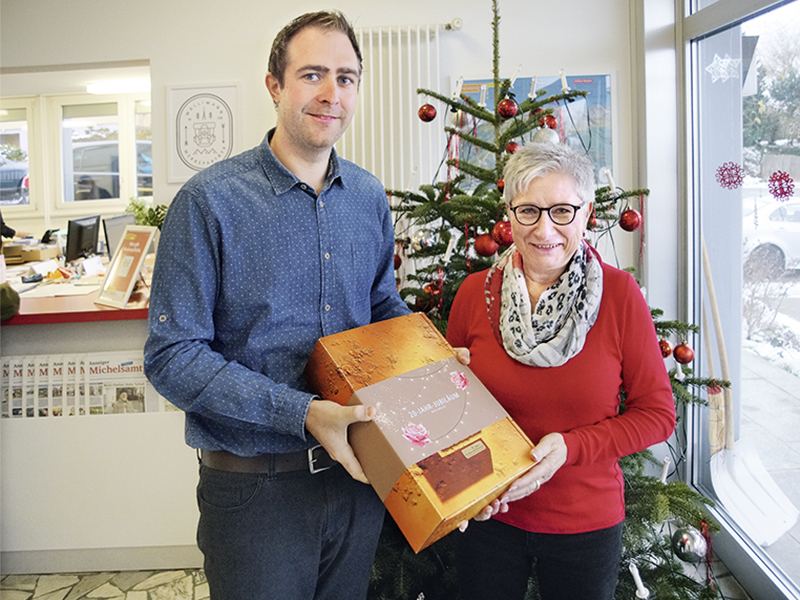 Zufall oder nicht? Gepasst hat es auf jeden Fall, dass Ruth Müller Jubiläums-Tag in den Farben Rot und Schwarz zur Arbeit kam, den Farben von Wallimann Druck. Hier hat sie am 1. Dezember 2000 die Arbeit als Büroangestellte aufgenommen. Die ersten Wochen hat sie noch in der Satz-Abteilung Texte für die Zeitung erfasst, bis sie dann an den Empfang wechselte, wo sie bis heute die Kunden mit einem herzlichen Lächeln begrüsst. Der Kontakt mit den Menschen ist für sie seit je her sehr wichtig und das spürt man auch. Dank ihrer feinfühligen Art, ist sie eine gute Gesprächspartnerin in allen Lebensfragen, sei es bei der Beratung für eine Danksagung oder einer Geburtstagskarte. Und obwohl der Ruhestand immer greifbarer wird, so ist bei ihr von Müdigkeit nichts zu spüren. Mit ihrer aufgestellten und pfiffigen Art weiss sie das Team anzustecken. Die ganze Wallimann-Belegschaft wünscht ihr für die Zukunft nur das Beste! Patrick Wicki, Geschäftsführer der Wallimann Druck und Verlag AG gratulierte herzlich zum Firmenjubiläum und überreichte ein Präsent.