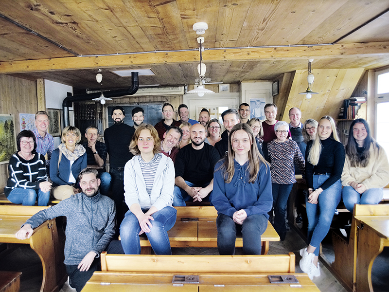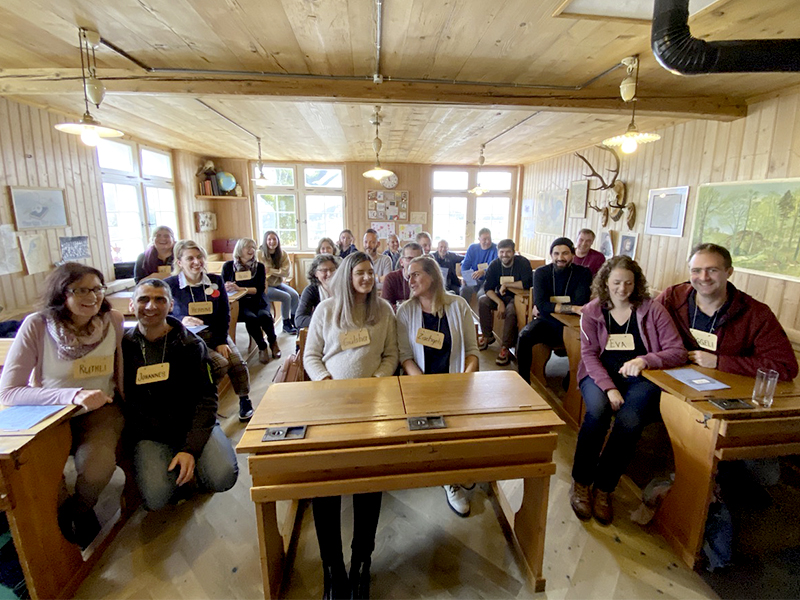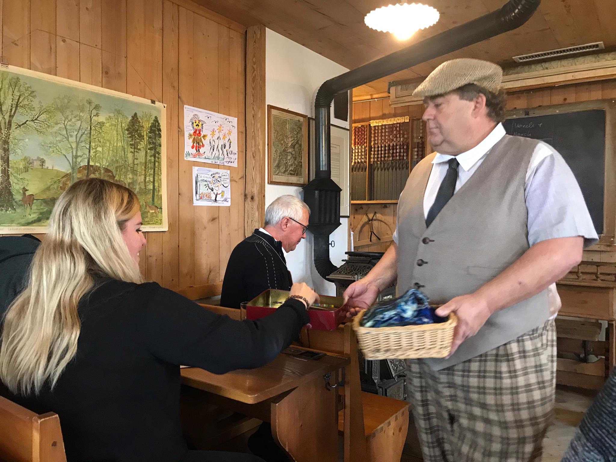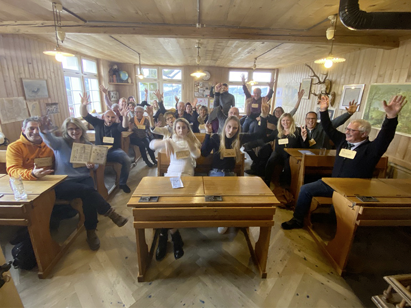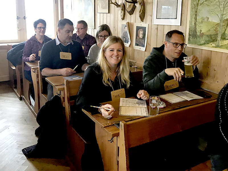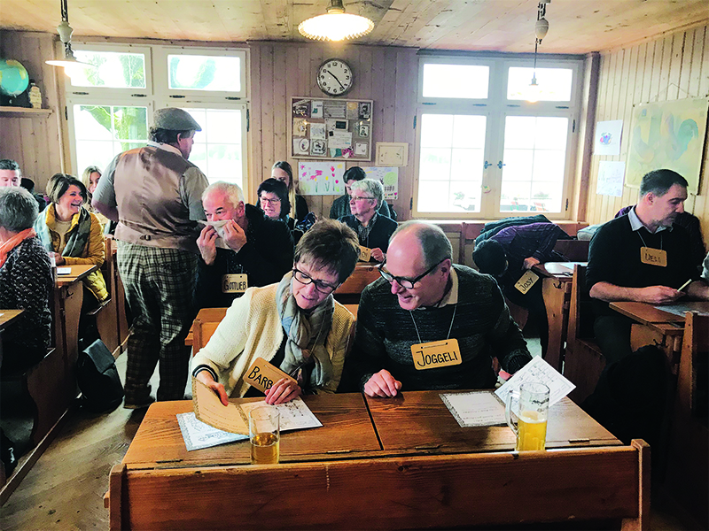 «Sönd willkomm!» hiess es für die Wallifrauen und -männer zur Begrüssung auf der Waldegg, dem Erlebnisgasthof ob Teufen im Appenzellerland, mit Blick auf das prachtvolle Säntisbergpanorama. Die Mitarbeitenden inklusive Begleitung durften sich im wahrsten Sinne des Wortes auf eine Zeitreise begeben und neben den urchigen Räumlichkeiten im «Schnuggebock», auch einen äusserst amüsanten Schultag wie zu Grossvaters und Grossmutters Zeiten im «Tintelompe» beim gestrengen Herr Lehrer Max Bünzli erfahren. Dem Einen oder der Anderen wurde es etwas mulmig zumute, als es mit Feder und Tinte ans Diktat, selbstverständlich in «Schnüerlischrift», ging. Die flüssige Erfrischung und der humorvolle Unterricht entspannte die Gemüter wieder vollends und sorgte für schallendes Gelächter.