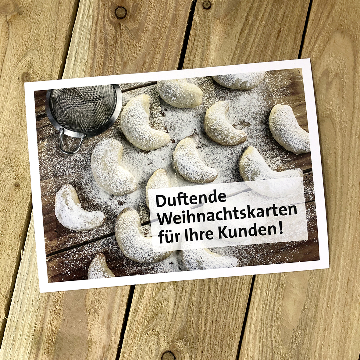 Gerne gestalten und drucken wir für Sie Weihnachtskarten mit dem passenden Bild und dem entsprechenden Duft.